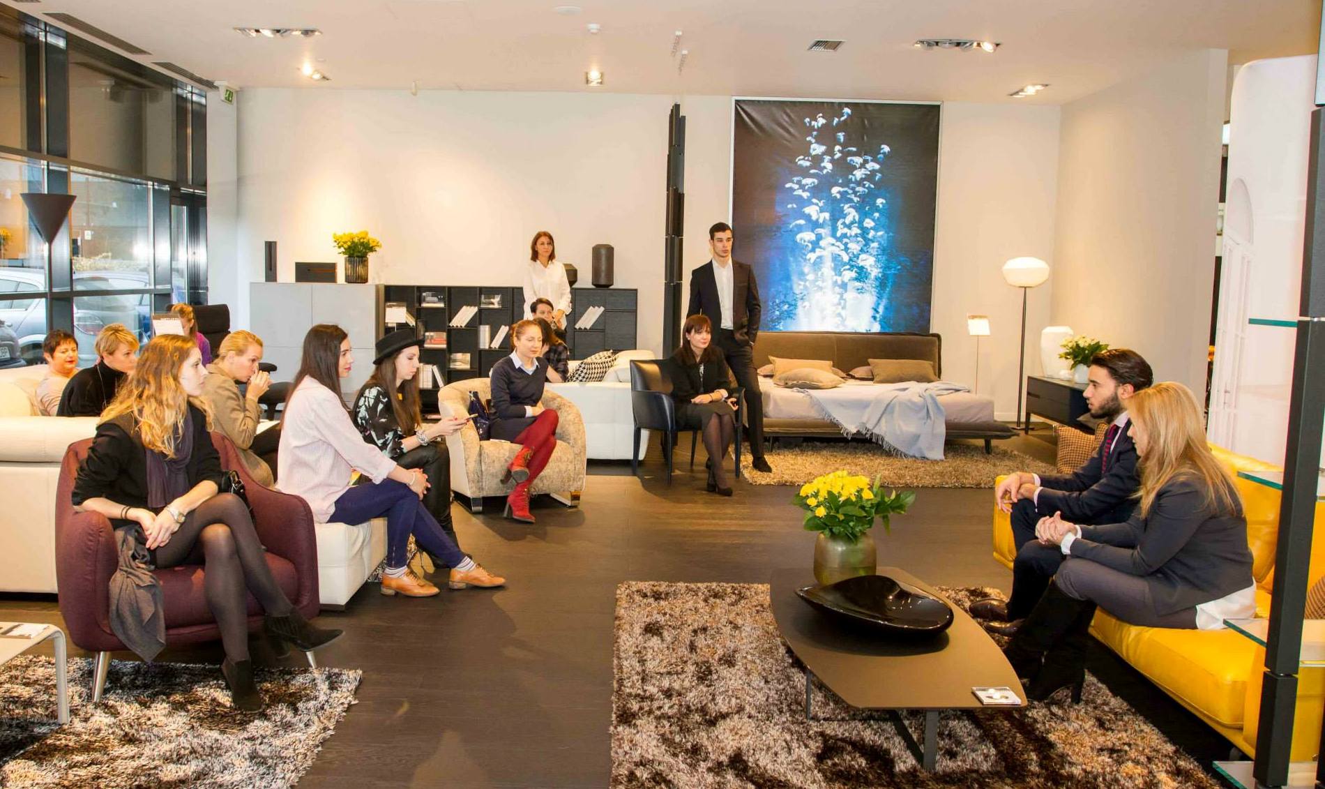 Primele senzaţii de la întâlnirea cu magazinul monobrand se rezumă la simţuri: aerul unei nopţi răcoroase de final de toamnă şi geamurile mari prin care se vedeau lumini, culori şi oameni zâmbind. Atmosfera relaxată şi uşor impunătoare, ca un pahar de şampanie cu istorie, s-a dezvăluit încă de la intrare. Pe măsură ce înaintam în noul spaţiu, observam cum culorile, materialele şi obiectele de decor prind viaţă, fiind îmbinate cu naturaleţe pentru a pune în evidenţă canapelele şi paturile, despre care am aflat puţin mai târziu că sunt elementele centrale ale showroom-ului.