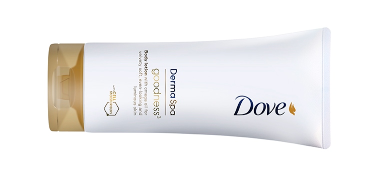 Dove DermaSpa dezvăluie patru game: Goodness3, Uplifted+, Summer Revived şi Intensive, iar comunicatul de presă precizează că acestea „conţin cea mai recentă inovație în îngrijirea pielii de la Dove: tehnologia Cell-Moisturisers™ (agenți de hidratare esențiali obținuți din uleiuri naturale) derivată din produsele pentru îngrijirea tenului. Tehnologia Cell-Moisturisers™ îmbunătățește starea barierei de protecție a pielii mai bine decât glicerina, principalul agent hidratant utilizat în majoritatea produselor de îngrijire a corpului.”